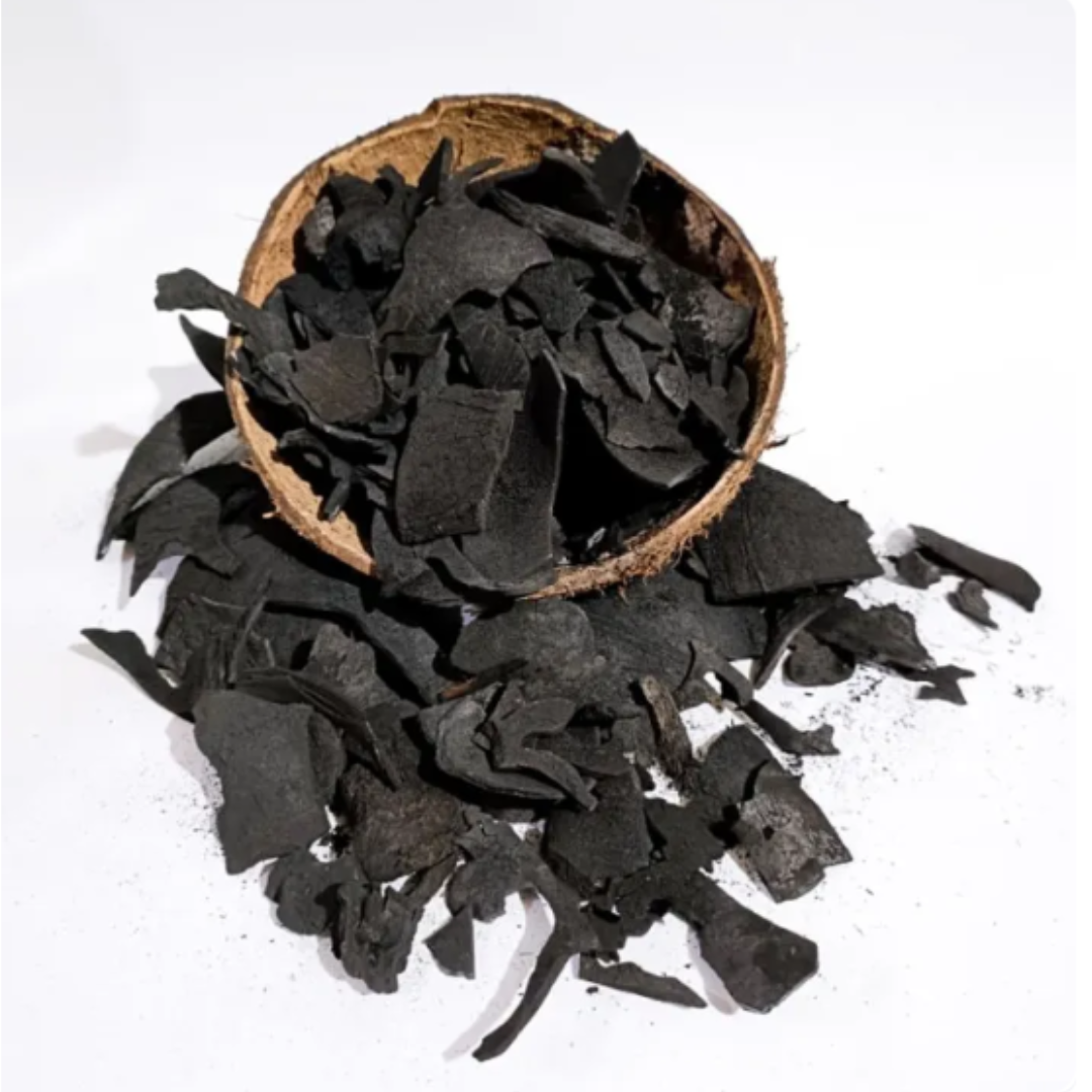 Charcoal is a black, porous material made by heating organic matter, like wood or coconut shells