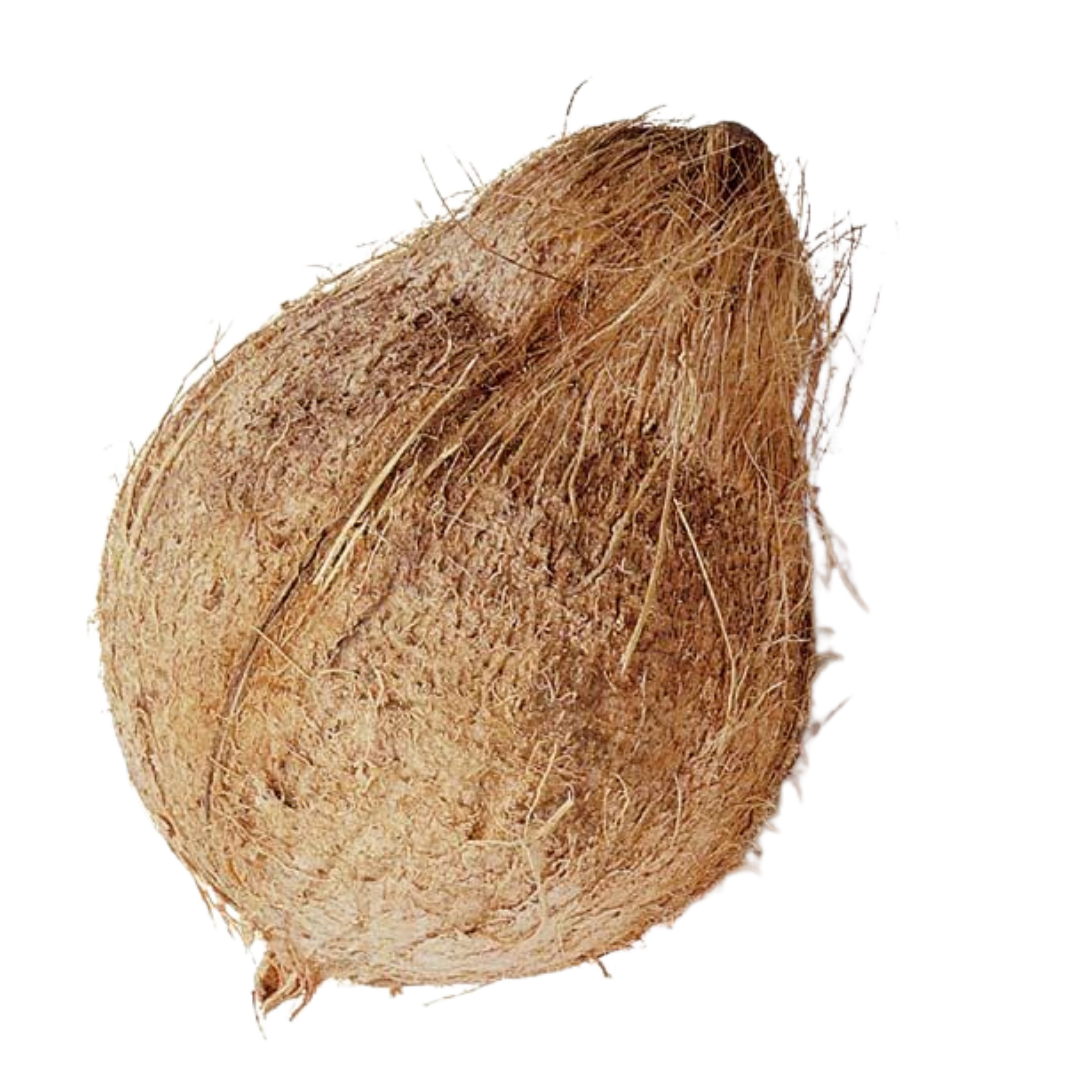 A semi-husked coconut is a mature coconut that has had part of its fibrous outer layer (husk) removed, leaving an exposed area around the "eyes" (germination pores).